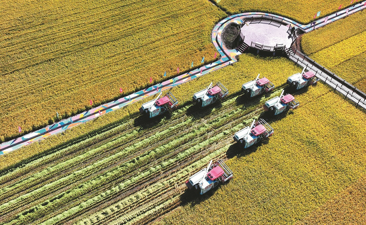 The rice harvest begins in Fangzheng county, Harbin, Heilongjiang province, on Sunday. ZHANG SHU/FOR CHINA DAILY