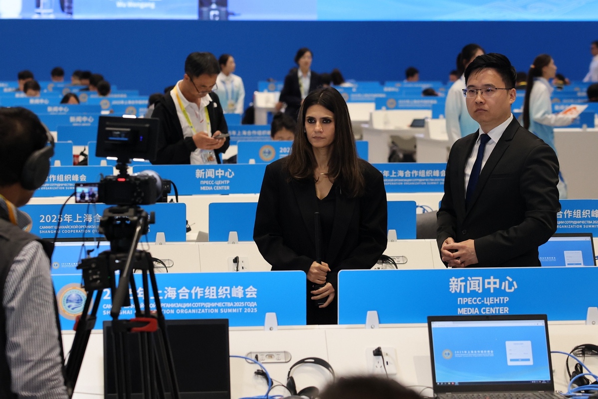 Reporters work at the media center for the SCO Summit 2025 in North China's Tianjin on Aug 30, 2025. [Photo by Wang Zhuangfei/chinadaily.com.cn]